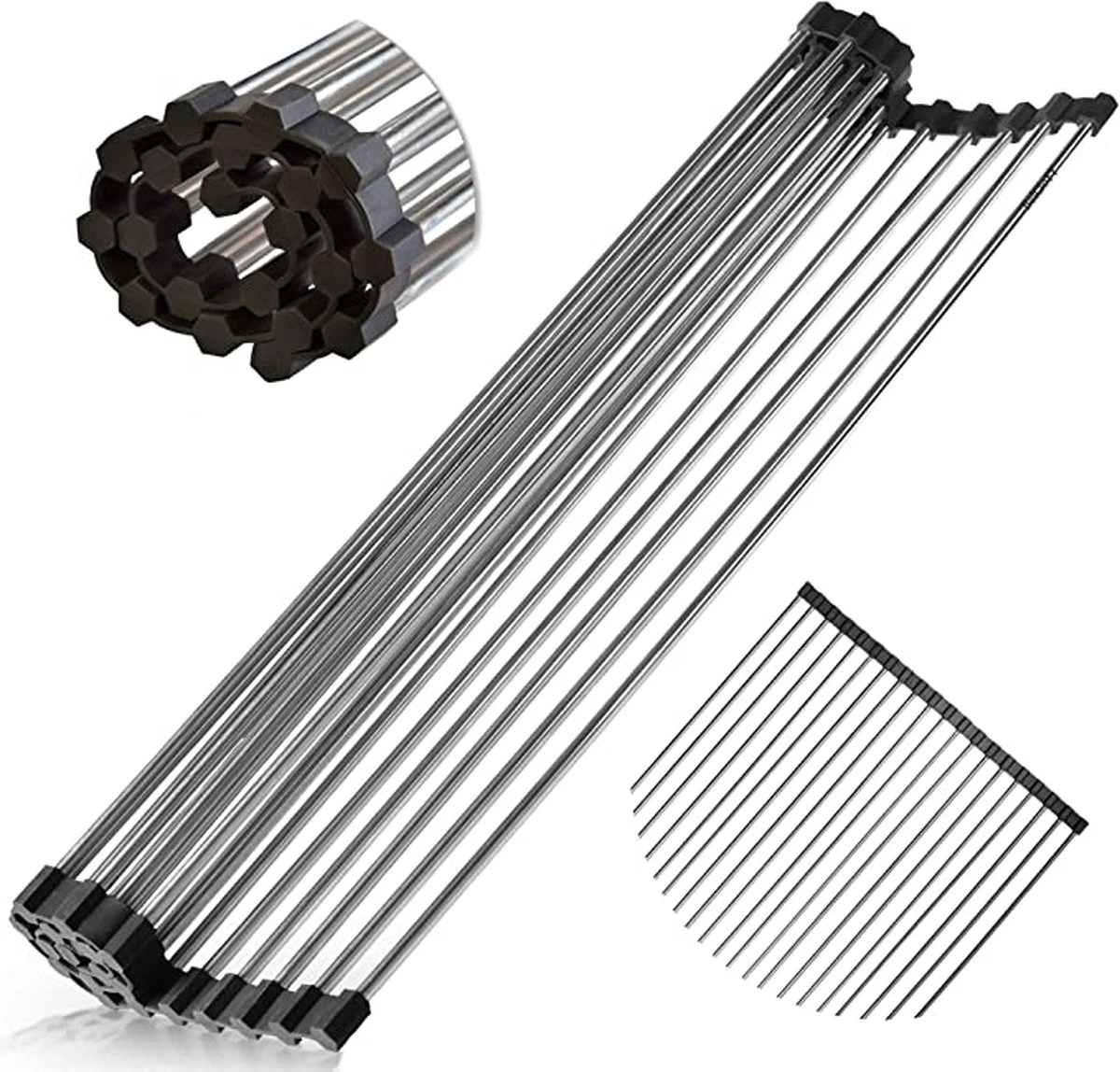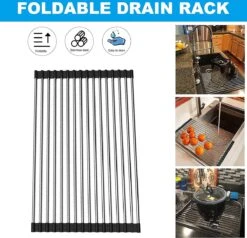 Het probleem met de meeste bordenrekken is dat ze ruimte in beslag nemen. Ons oprolbare afdruiprek heeft een flexibel ontwerp, het rolt op als een gootsteenmat en neemt minimale ruimte in beslag. Dit maakt hem ideaal voor elke keuken. Gemaakt van roestvrij staal en volledig bedekt met siliconen van voedingskwaliteit, waardoor het rek volledig slipvrij blijft. Het is hittebestendig tot 205 graden.