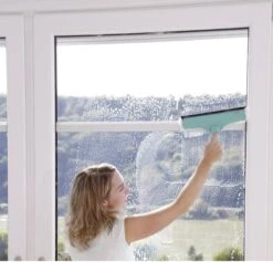 De raamwisser 3-in-1 van Leifheit is het unieke allround talent in zijn soort en zorgt voor een duidelijke werkverlichting. Met dit unieke apparaat kunnen drie werkprocessen in één worden uitgevoerd: Ramen wassen, hoeken en ramen reinigen, schoontrekken. De unieke doek rondom uit microvezels maken dit mogelijk, omdat deze de zijdelingse vensters gelijk meeneemt. Dat spaart enorm veel tijd en moeite. Na de reiniging zorgt de geïntegreerde treklip voor een streeploze glans. Voor beweeglijkheid en maximaal bedieningscomfort beschikt de handruitenwisser over een draaischarnier. Zo is deze uitstekend geschikt voor het effectief reinigen en schoontrekken met slingerbeweging – de techniek van de professionals. De mopbreedte bedraagt 32 cm. De greep maakt het gebruik van een Leifheit Click-systeem-steel met telescoopfunctie mogelijk.