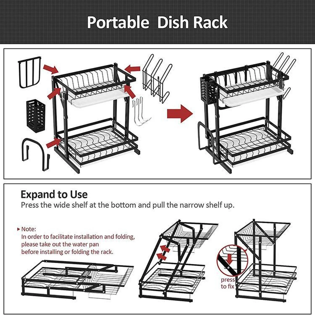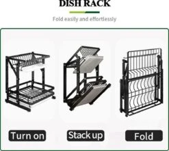 De compacte afdruiprek is gemaakt van hoge kwaliteit, roestvrij staal en antikras materiaal. Frame, antislip en de connectors zorgen voor een solide ondersteuning, zodat de rek soepel beweegt en stabiel staat. - GEEN INSTALLATIE NODIG