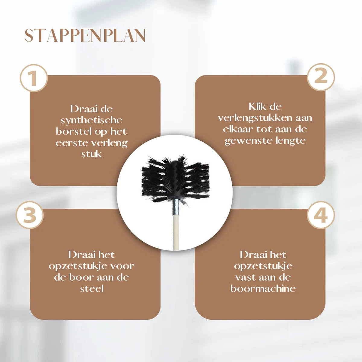 Om moeilijk bereikbare plaatsen te bereiken beschikt de schoorsteenborstel over een buigzame en flexibele steel. Tevens is de steel verlengbaar tot 6 meter door een eenvoudig kliksysteem. Hierdoor maakt de borstel ook alle hoekjes en bochten goed schoon.